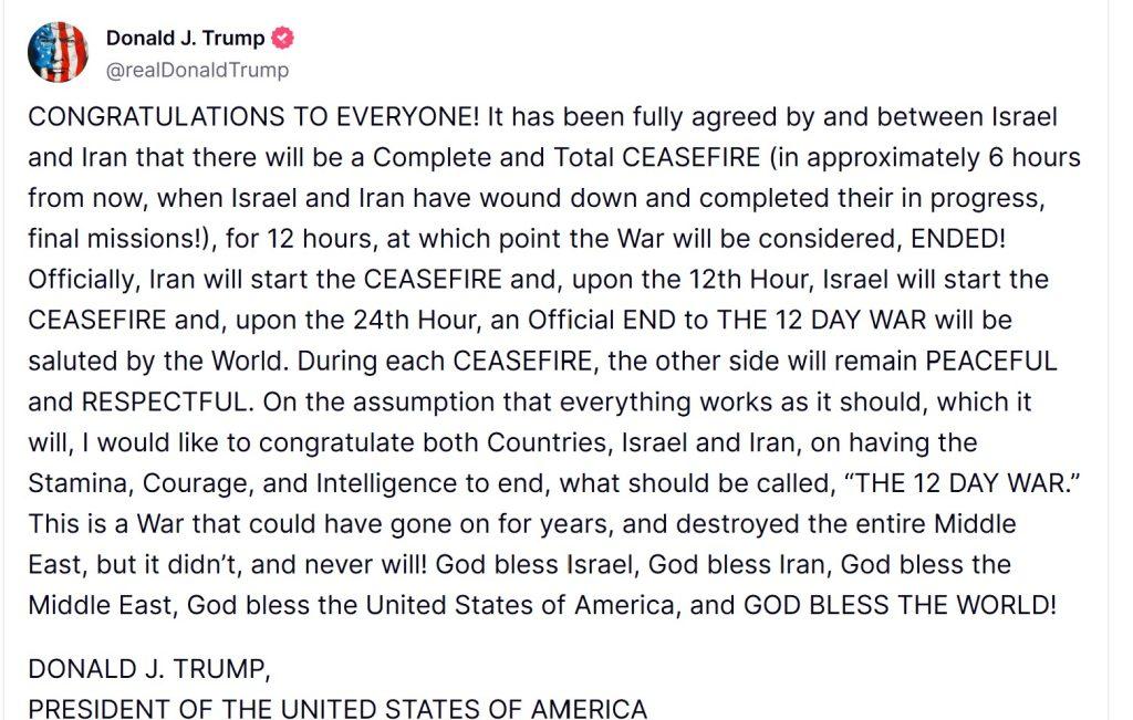 by Sharon Rondeau https://truthsocial.com/@realDonaldTrump/posts/114734934153569653 (Jun. 23, 2025) — On Monday at approximately 6:30 p.m. EDT, President Trump announced on TruthSocial “a Complete and Total CEASEFIRE” was agreed to by Israel and Iran following 12 days of reciprocal military attacks. Israeli and U.S. intelligence claimed Iran was just “weeks” away from an ability to release a nuclear […]